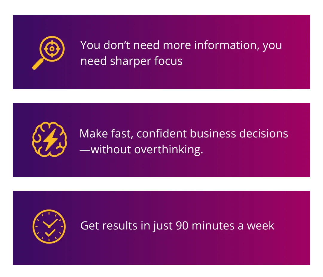 Instead of endless calls and one-size-fits-all advice, this is the missing piece that gets you results in just 90 minutes a week, built to save your time and give you actual answers fast.